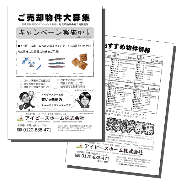 弊社では、輪転機(印刷機)を最大限に活かし、毎週3000枚から5000枚の不動産情報チラシをポスティングと新聞折込を織り交ぜながら、戦略的に配布しております。社長自らとスタッフが積極的に配布し、手マメ、足マメ、口マメの実践をしております。